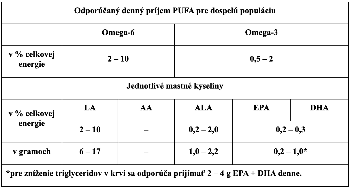 • Omega-6 mastná kyselina LA – znížte jej príjem pod 3% z celkovej energie (do 7 g denne pri dennom príjme 2 500 kcal).